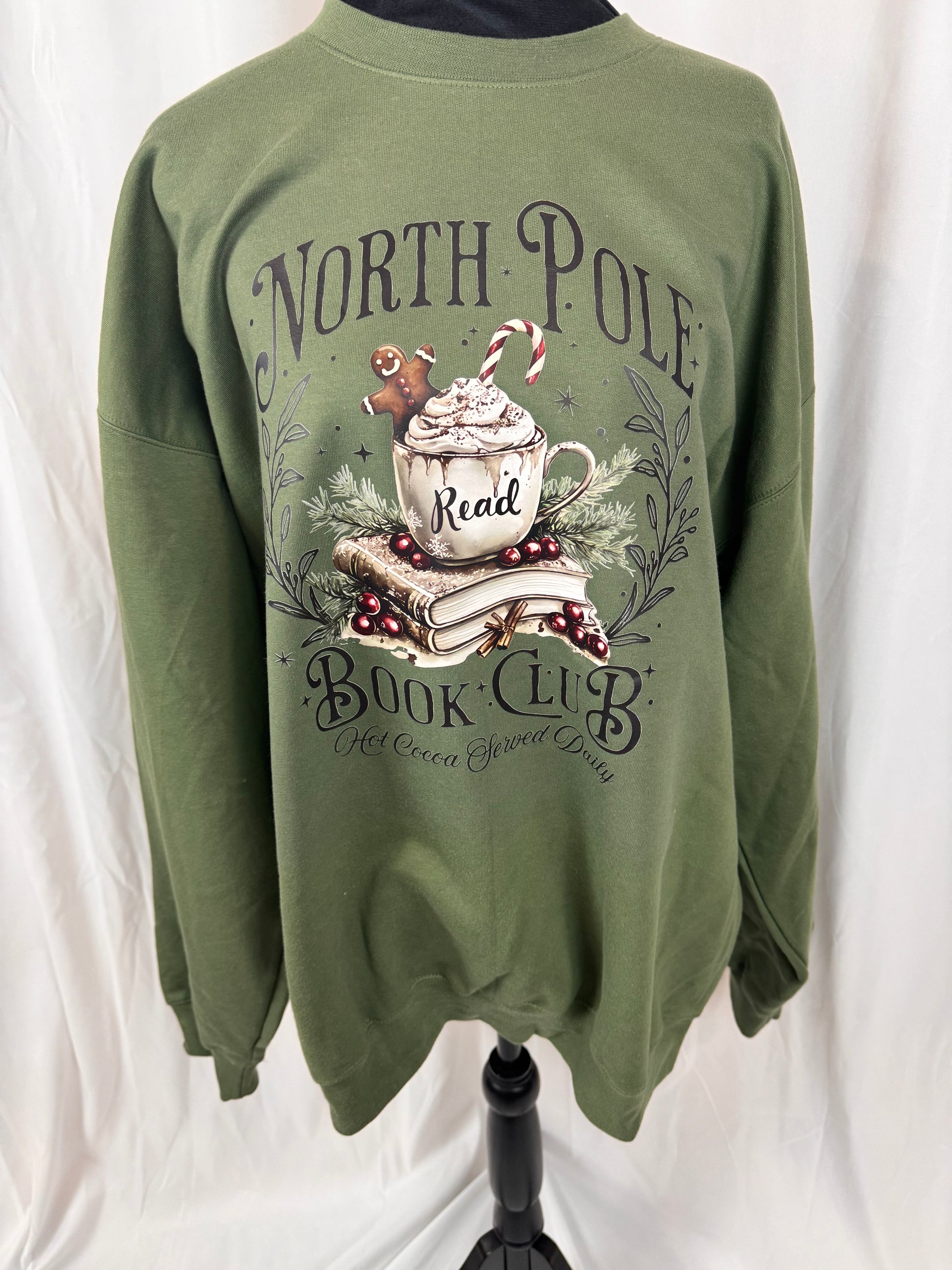 Get cozy and festive with this North Pole Book Club sweatshirt in a rich military green. This is the perfect winter sweatshirt for all the cozy book lovers! Made from a soft Gildan cotton-polyester blend, its classic crew neck design keeps you comfy all day while spreading holiday cheer in a playful way. Perfect for chilly winter days and spreading that magical Christmas spirit wherever you go!