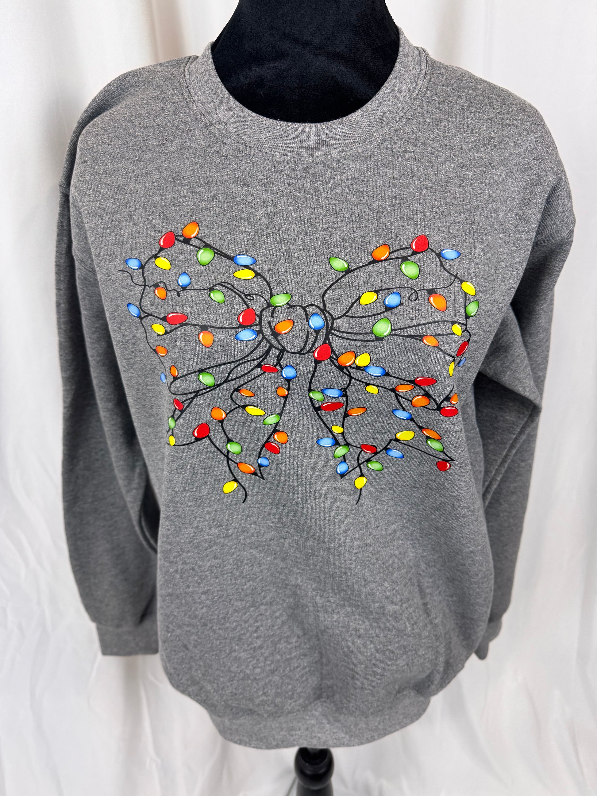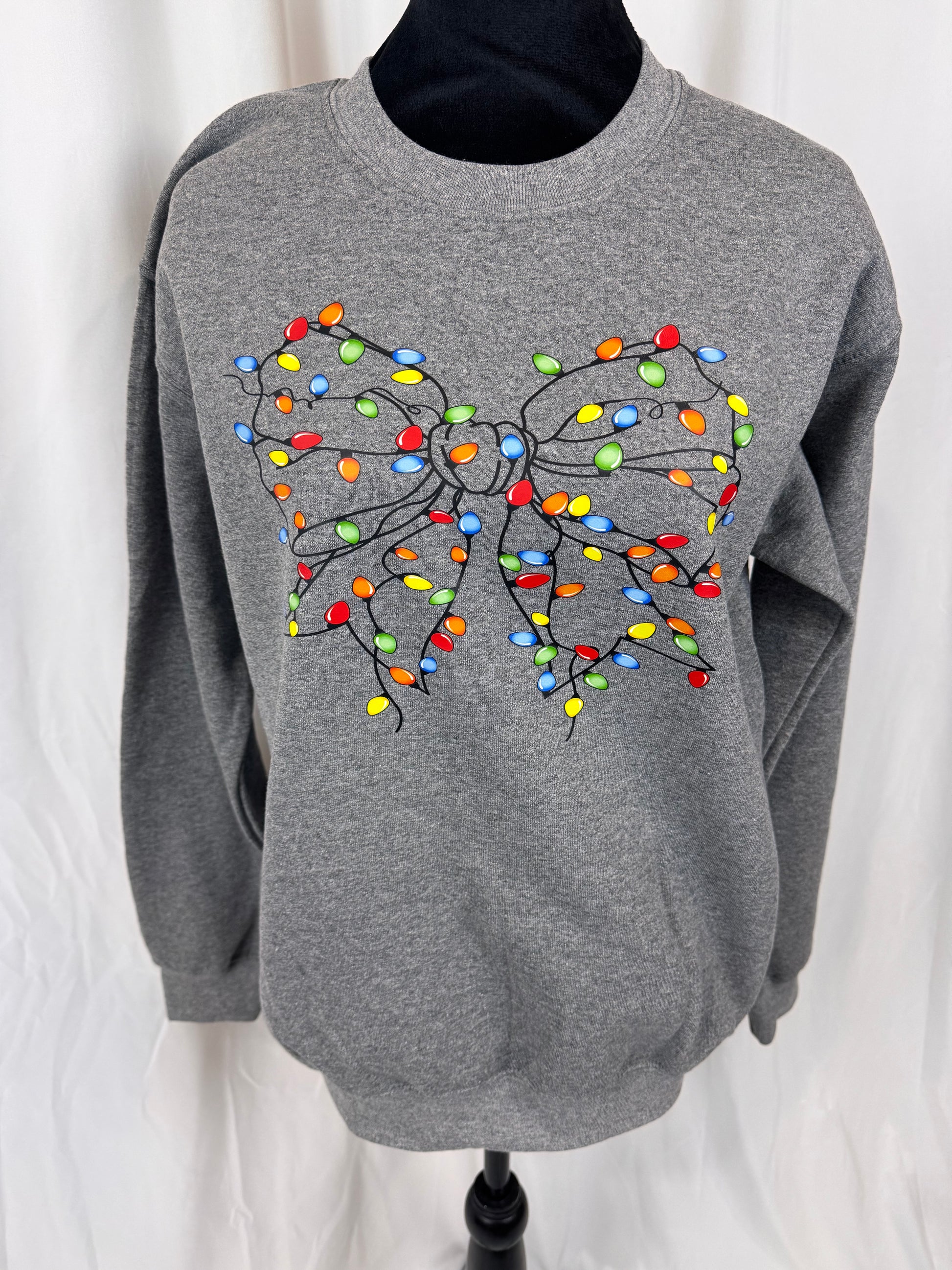 This cozy Christmas sweatshirt is perfect to add to your wardrobe for the whole season! It's festive and cheery with the pretty coquette bow decorated in Christmas lights, showing that the chaos of the holiday season can be really cute!
