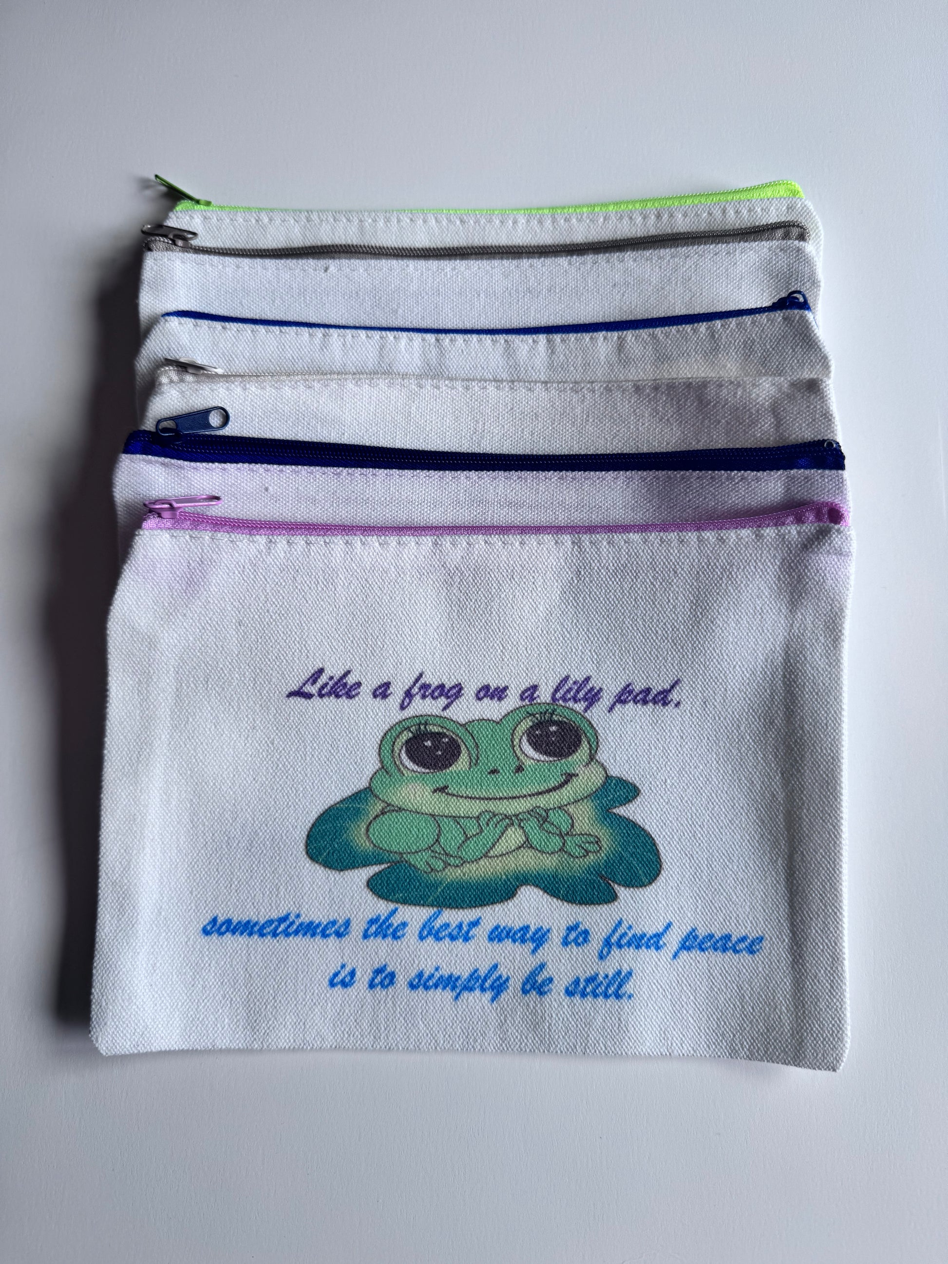 These 8x6 zipper pouches are adorable with a cute froggy design on the front. The design is originally designed by me. I sublimated the artwork on the canvas bag using a heat press. The bag comes empty and is ready for you to fill with anything from pencils to bookmarks! *** Feel free to check out my froggy bookmarks for some that match this adorable bag!***