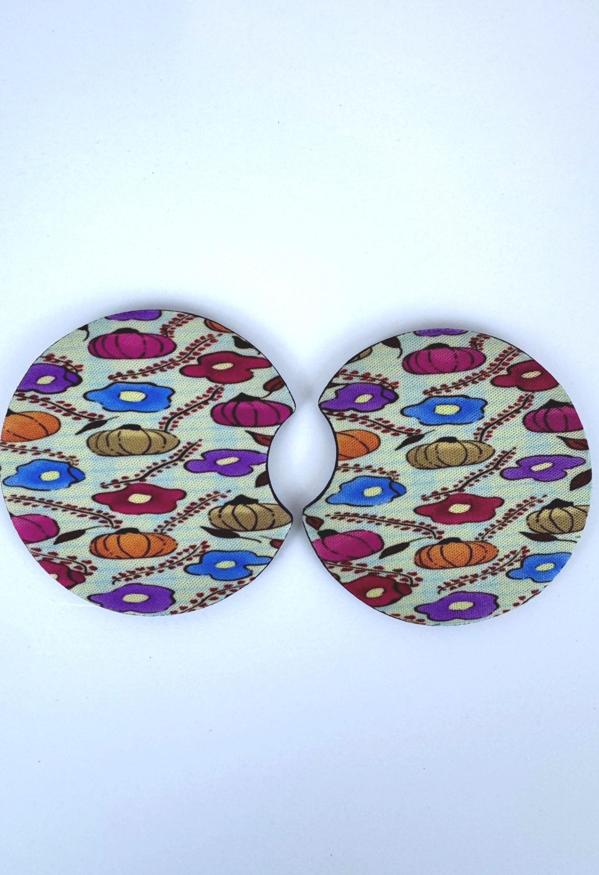 This pumpkin floral pattern looks so cute on these absorbent car coasters! This is a hand drawn design by Hanna @ Outfolded. The background of the design is beige and blue plaid design.