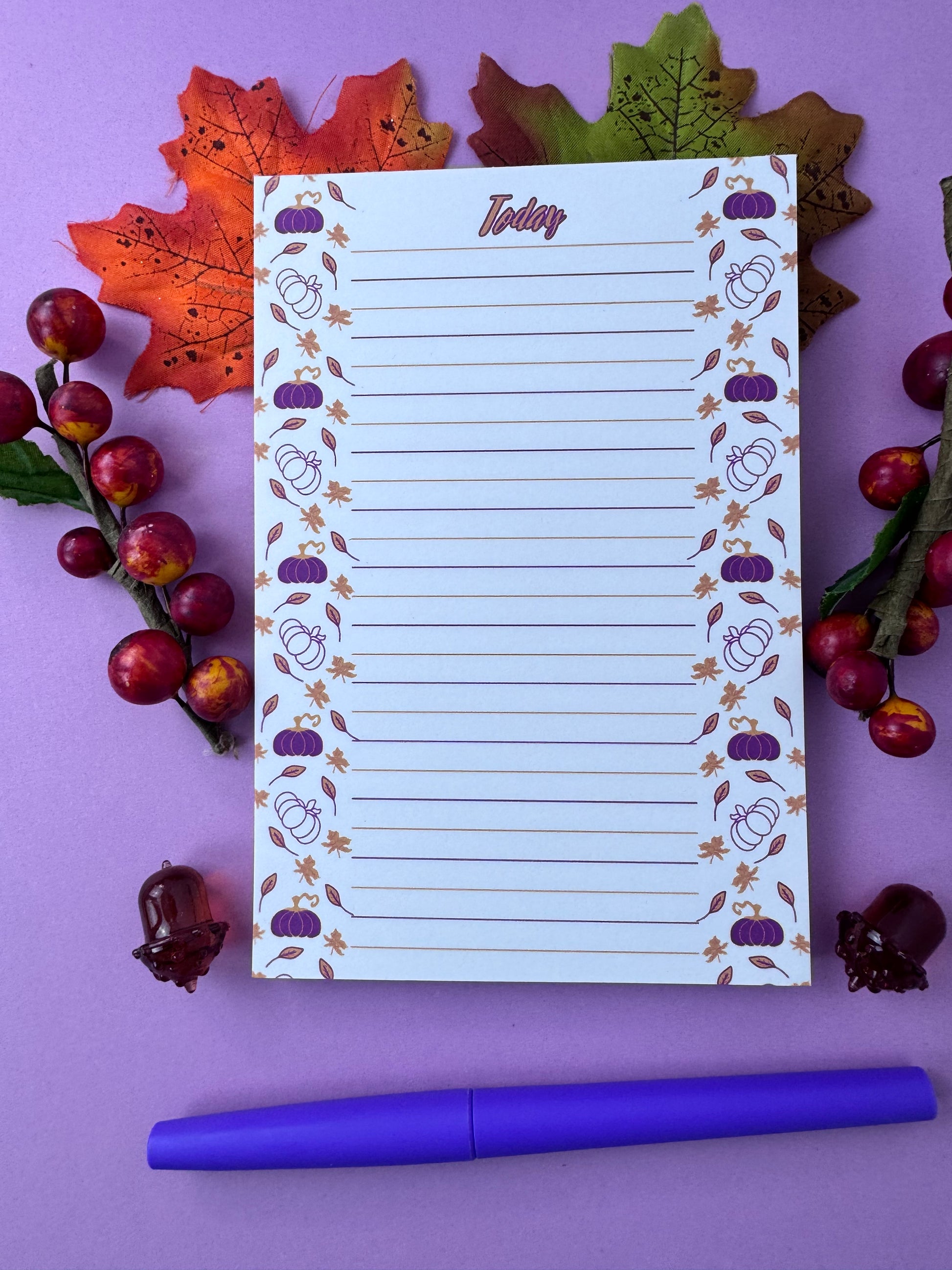 Celebrate the cozy charm of autumn with this playful Purple and Gold Pumpkin and Leaf Notepad. Handmade and hand-drawn, each lined page invites you to jot down your thoughts or doodle in style. Perfect for seasonal notes, lists, or creative bursts, this stationery adds a splash of fall whimsy to every word you write.