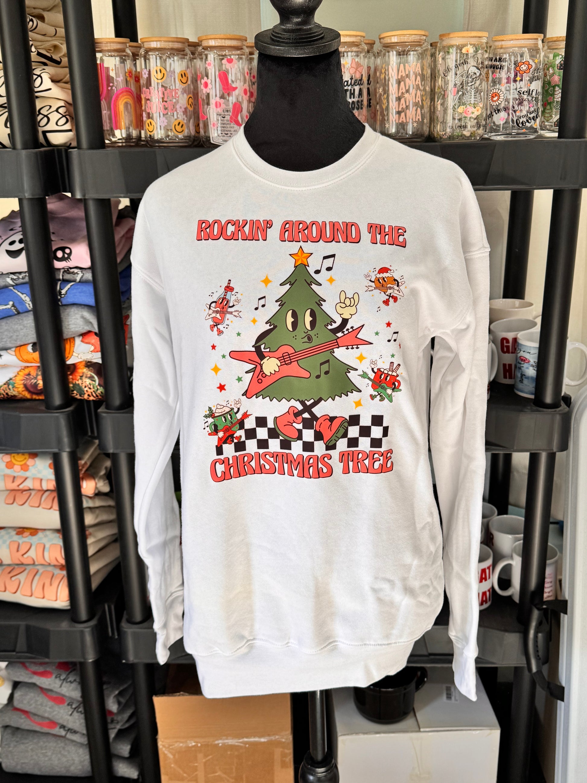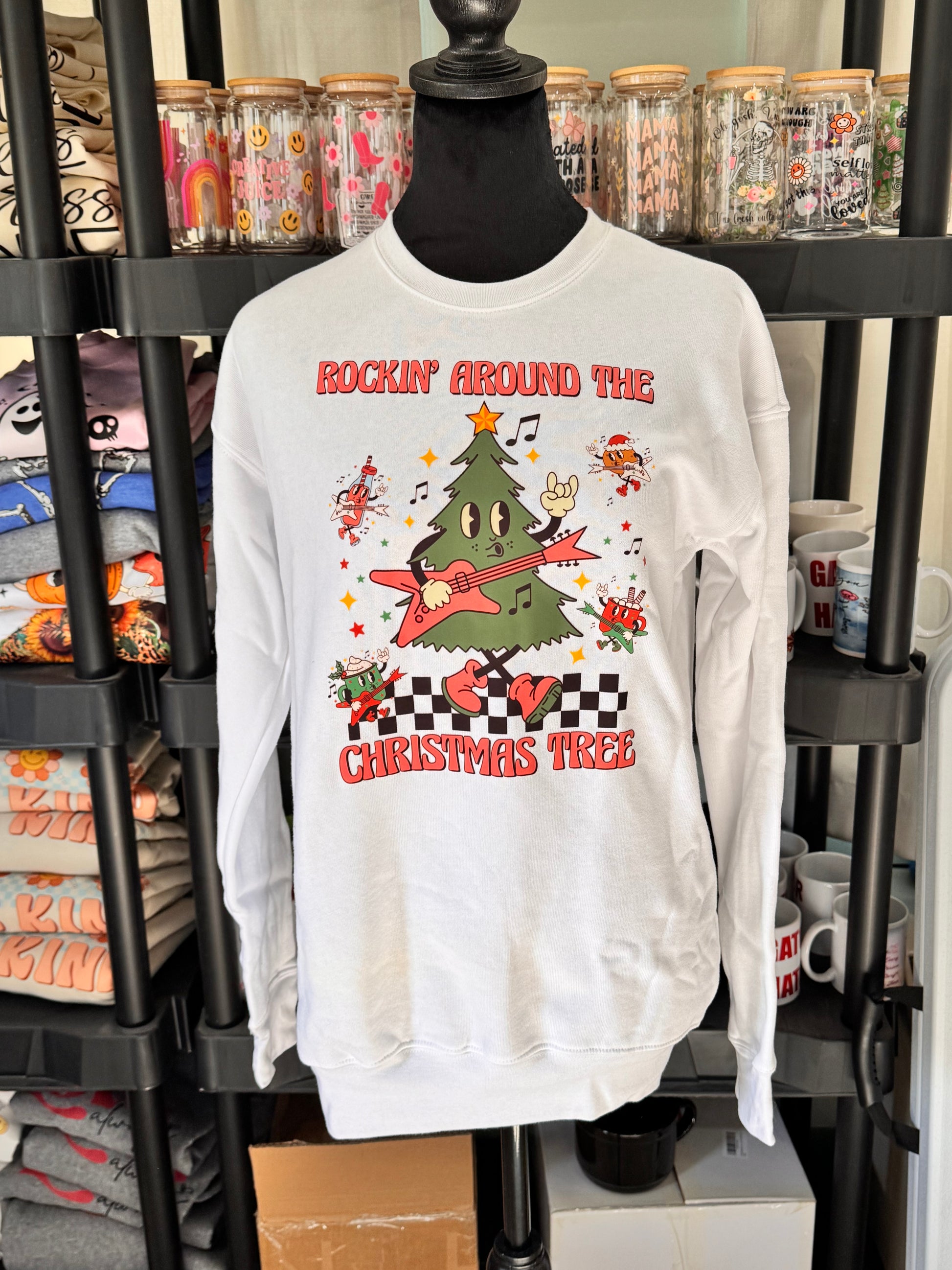 Celebrate the holiday spirit in playful style with this white crew neck sweatshirt featuring a charming Christmas tree character singing festive tunes. The "Rockin' Around The Christmas Tree" design adds a joyful touch to your cozy wardrobe, perfect for spreading cheer at holiday gatherings or relaxed winter days. Soft and comfortable, this sweatshirt brings warmth and holiday fun together effortlessly.