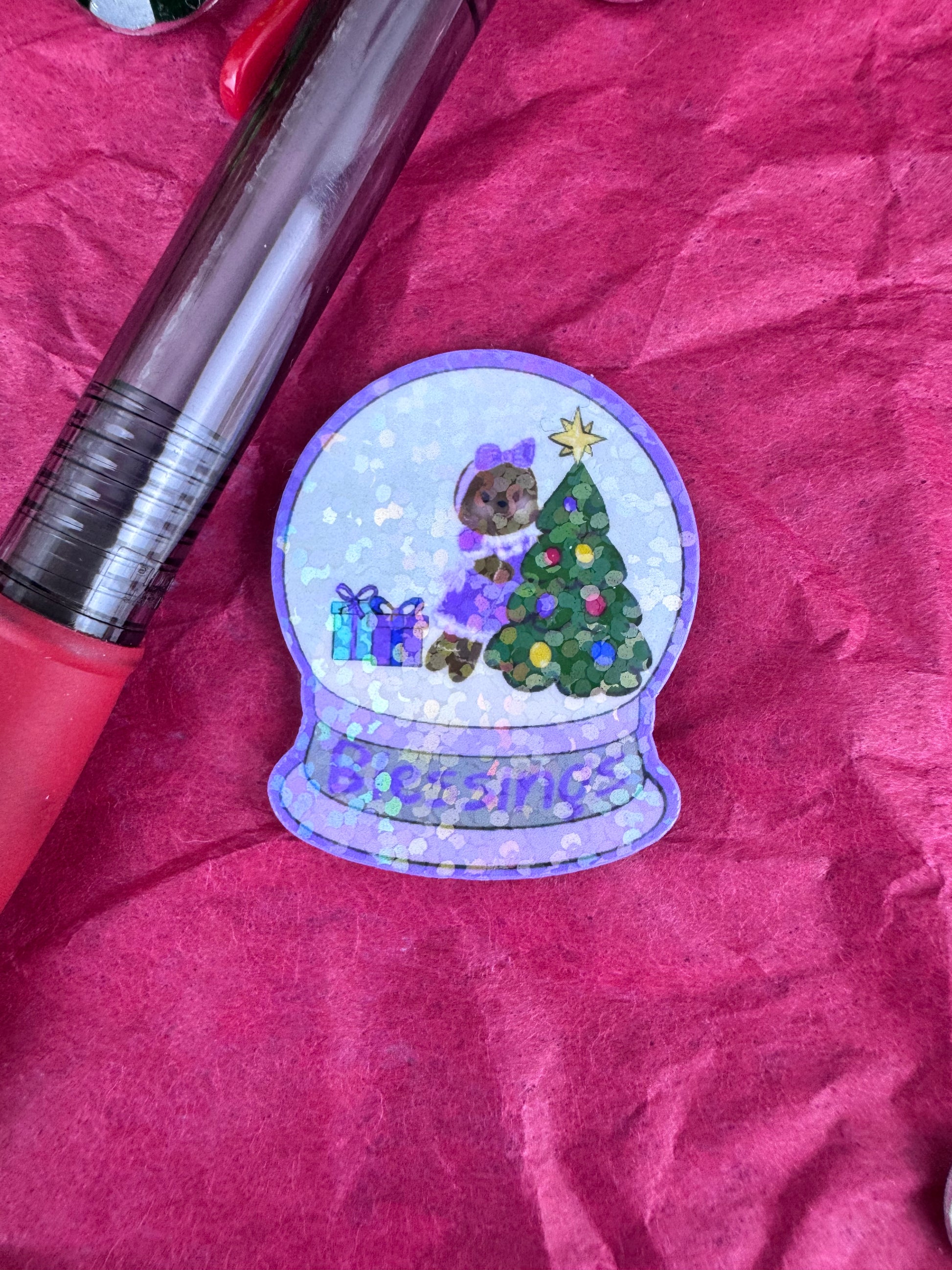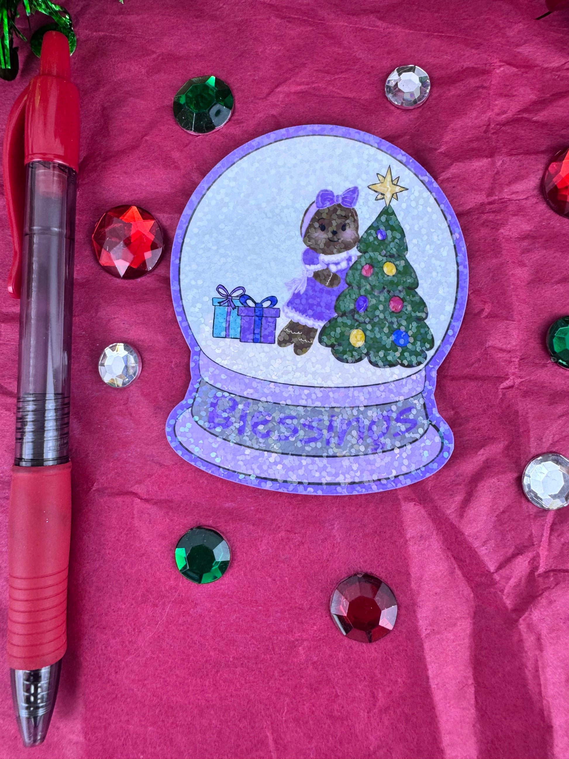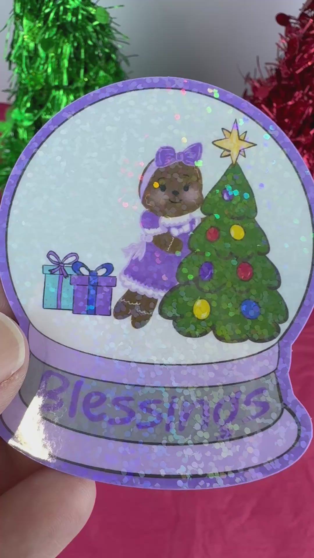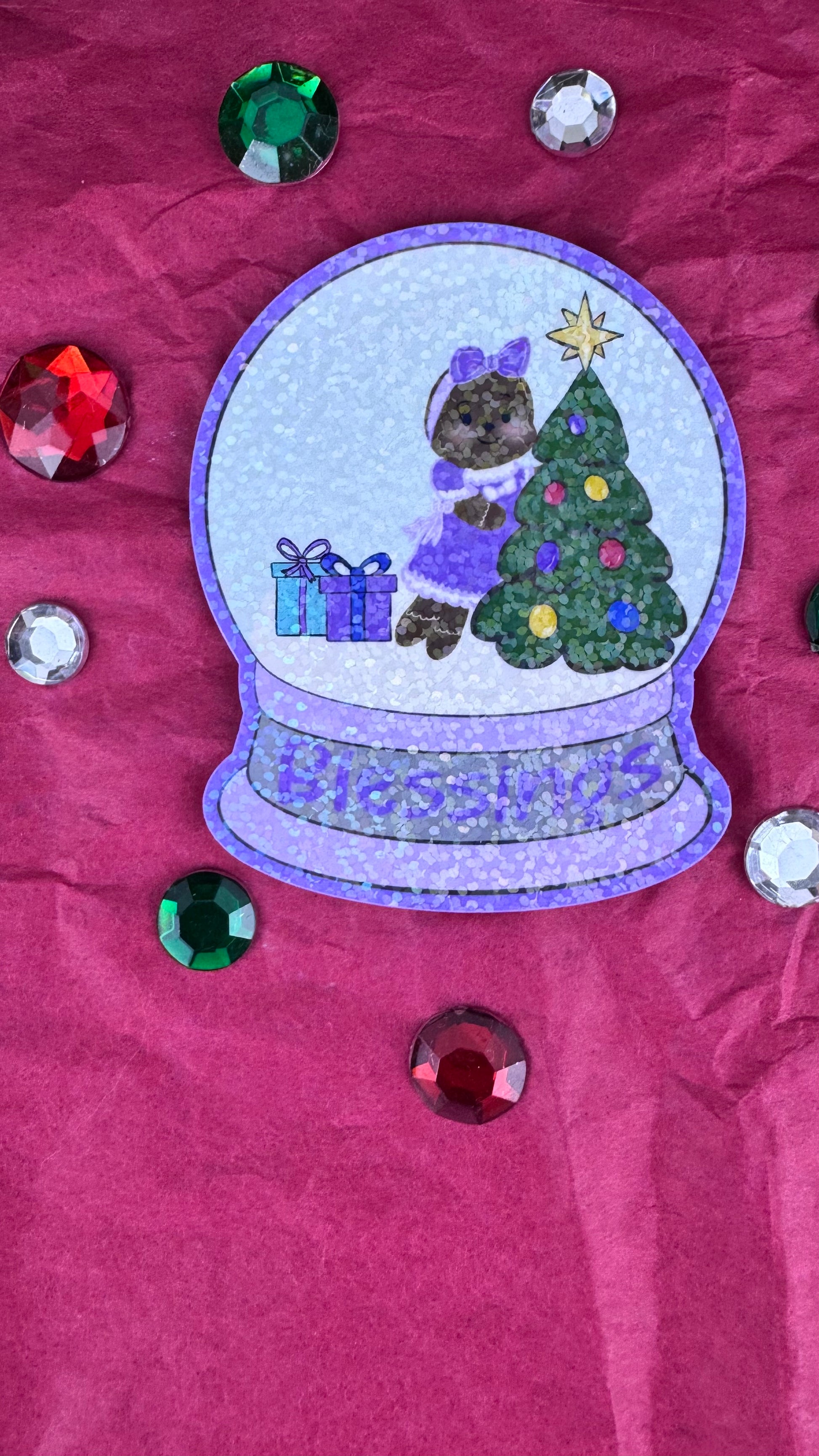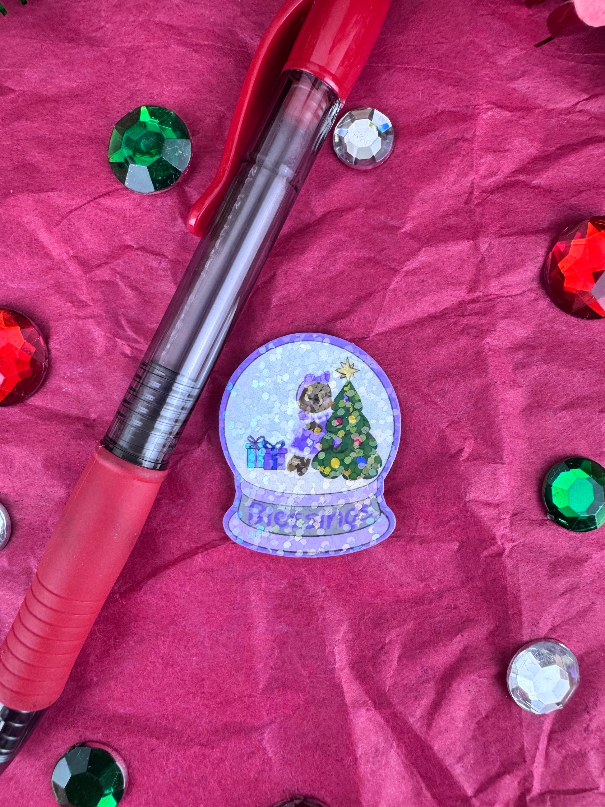Made on matte white vinyl sticker paper and laminated with snow theme holographic laminate.
